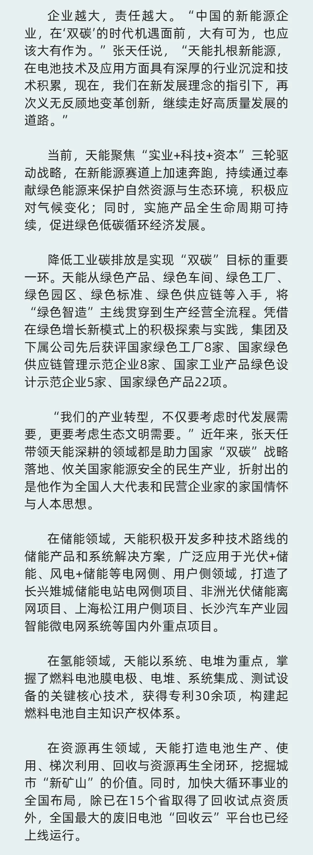 全国“两会”正在进行中,全国人大代表、JIUYOU.COM-九游控股集团董事长张天任提出了高质量建设新型储能体系、尽快出台强有力氢气补贴、加强回销一体化示范项目推广、鼓励各类电池技术平行发展等具体建议,为推动能源转型,守护绿水青山积极建言献策。